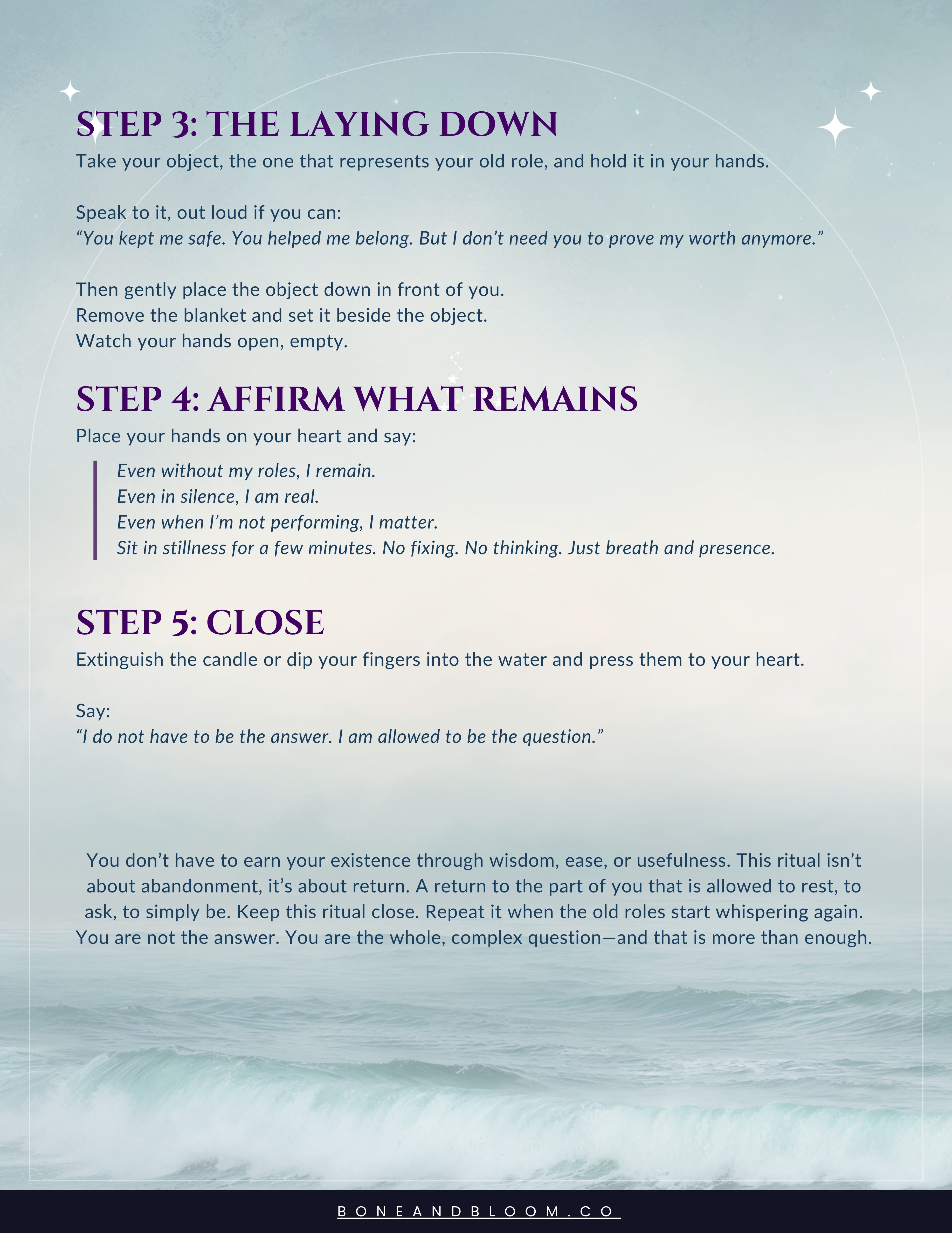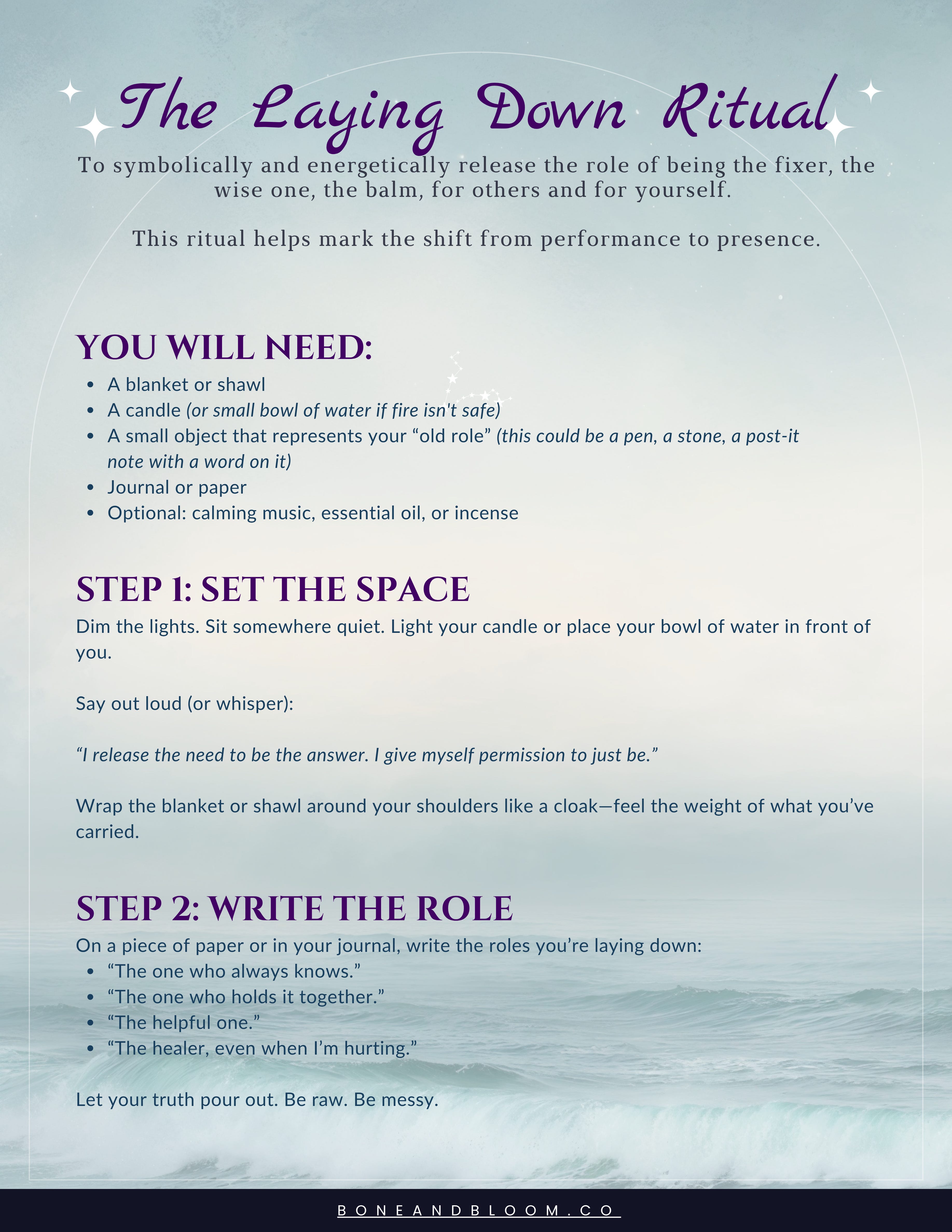If that piece stirred something in you, if you felt the ache of always being the fixer, the strong one, the container, this ritual was made for that version of you. The one who's slowly remembering she doesn’t have to hold it all. It’s the practice I now return to when I feel myself slipping back into the shape of an answer. If you missed it, you can read that post below.