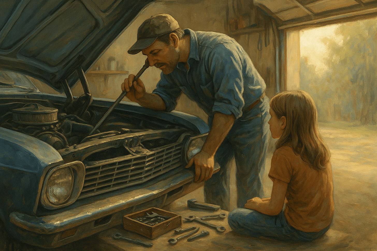 One of my favorite memories: him leaning under the hood of a car with his ear pressed to a giant screwdriver. When I asked what he was doing, he said, “That’s how I can tell if something’s vibrating. Helps me find what’s loose.”